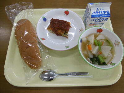 ・牛乳 ・さつまいもパン ・ほうれんそうオムレツ ・カブとベーコンのスープ