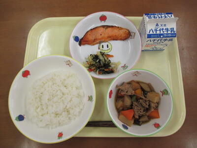 ・牛乳 ・ごはん ・さけのしょうゆやき ・いそあえ ・ぶたにくとごぼうのうまに