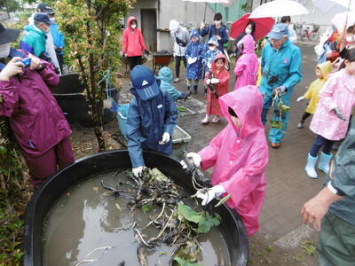 5月7日(日)、「妙典小ハス田クラブ」の皆さんが、今年も、はすの苗植えを体験しました。あいにくの雨にも関わらず、約20名の親子が参加。指導してくださるのは、元ハス農家の篠田さんと同クラブ事務局の安達宏之さんです。安達さんは、本校の地域学校協働活動推進員でもいらっしゃいます。また、環境保護団体「三番瀬フォーラム」の皆さんが、サポートしてくださいました。子どもたちは、昔の妙典地区やハスの成長の様子について、貴重なお話を熱心に聞いていました。その後の作業では、学校のハス田(大桶)の中からどろんこになりながら、ハスを見つけては大はしゃぎ!ちょうどよい大きさのハスを苗として改めて植え付けしました。これから、すくすくと大きく育ってほしいですね。収穫は、11月3日(祝)の予定です。今では面影もありませんが、かつて、妙典・行徳地区一帯には、ハス田が広がっていました。その最後のハス田を守り育てているのが、妙典小ハス田クラブです。学校と地域が連携して活動しています。