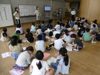 代表委員会主催による「1年生を迎える会」が開催されました。学年ごとに上級生が、1年生に向けて、学校の施設やお世話になる先生方、給食、学習、遊び様子などについて、楽しくわかりやすく紹介してくれました。1年生は、笑顔いっぱいで身を乗り出して見ていました。これからの学校生活がますます楽しみになりましたね。お礼に、1年生は、「ドキドキドン一年生」の歌を元気いっぱい歌いました。一人一人の「あったかはあと」が、アリーナいっぱいに溢れた素敵なひとときでした。会終了後、上級生が心を込めて手作りした「はあとメダル」が1年生に贈られると、子どもたちは首から下げたメダルを手に取り、何度も嬉しそうに見ていました。