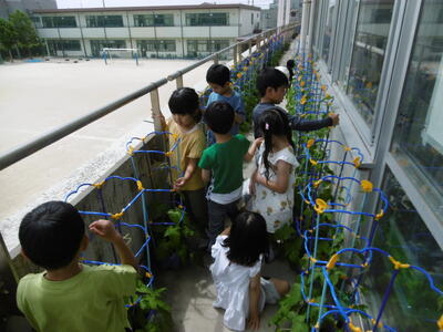 2年生は、登校すると大忙し!一人一鉢栽培で育てている「野菜(ミニトマト、ナス、キュウリ、枝豆、ピーマン)」へ丁寧に水やりをします。5月下旬から、葉がどんどん大きくなり、蔓もぐんぐん伸びています。「校長先生、蔓がこんなに伸びたよ!」「ここに、小さな実ができてきたよ!」…子どもたちは、毎朝、「自分の野菜」の世話を一生懸命しながら、成長の様子を楽しそうに観察しています。