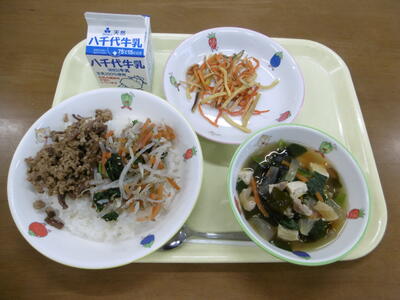 ・牛乳 ・ビビンバ ・野菜チップス ・中華スープ