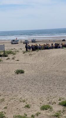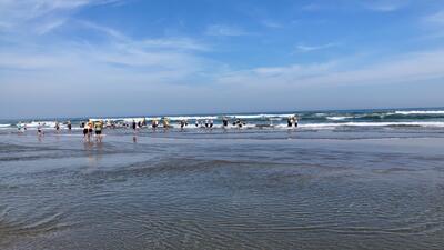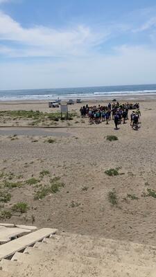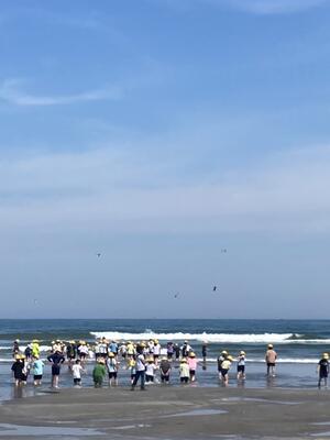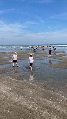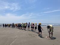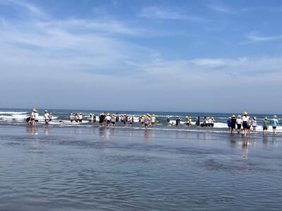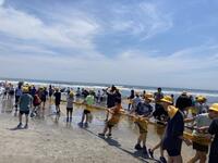 九十九里浜に到着。光る海、広がる砂浜を前に、子どもたちからは大歓声が上がりました!いよいよ地引き網にチャレンジです!