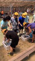 飯盒炊爨中です。野菜を切ったり、かまどに火を焚べたり、ご飯を炊いたりして、悪戦苦闘しています。みんな夢中で活動しています。