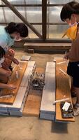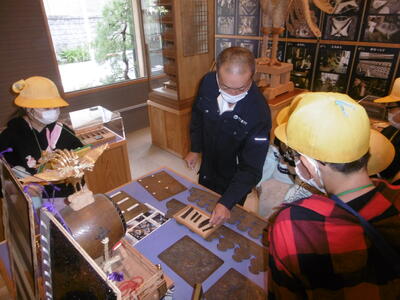 4年生では、総合的な学習の時間に「妙典の町」をテーマに探究学習に取り組んでいます。歴史、文化、自然など、妙典には魅力が、いっぱい!子どもたちは、町探検での発見や気付きをもとに、「自分の知りたいこと」について、さらに学びを深めています。先日は、2組、3組が、「神輿(みこし)のなぞ」について調べるために、「行徳神輿ミュージアム」の見学に行きました。中台製作所の社長さんから、神輿の実物を前に、その構造や製作工程、材料となる木材、漆、金属などについて「たくさんのひみつ」を教えていただきました。「神輿は、釘や接着剤を一切使わないで、組み立てているんだよ」と聞いて、子どもたちは、びっくり!その理由には、「なるほど!」と納得していました。職人さんの実際の仕事の様子も見学させていただき、カンナ削りや彫金の「職人技」に舌を巻いていました。最後は、みんなでお神輿も担がせていただき、大満足の笑顔でした。