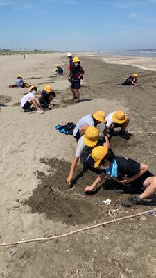 3年生が総合的な学習の時間で江戸川の干潟散策を行いました。妙典小学校の学校地域協働推進委員である、安達宏之さんを講師としてお招きし、干潟に住む生き物について教えていただきました。現場では、国土交通省からの依頼で河川敷の護岸工事を請け負っている建設会社の方々が、簡易的な水道や足洗い場、トイレまで用意してくれました。