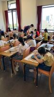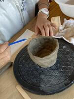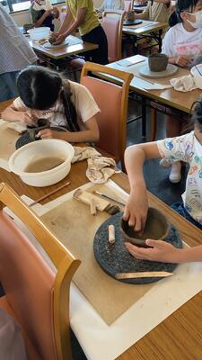 ホテルに着き、涼しいオーシャンビューの広い部屋で、陶芸教室が始まりました!湯呑みやコーヒーカップなど、子どもたちは熱心に作品作りに取り組んでいます。