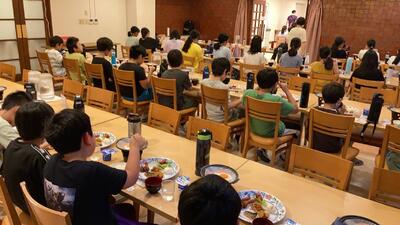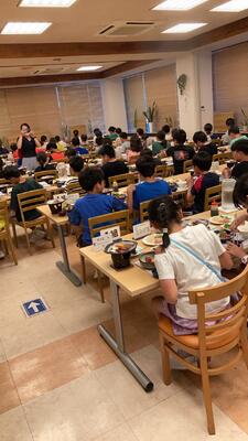 たくさん活動してお腹ペコペコの子どもたち。おまちかねの夕食タイムです。美味しそうなゴージャスメニューに子どもたちも、笑顔いっぱいです。