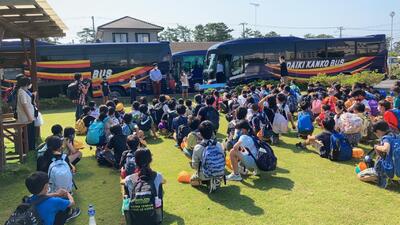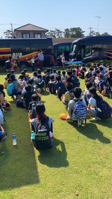 おはようございます。5年生の臨海学校がスタートしました。98名全員元気に、九十九里浜に向け、出発しました。