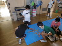 1年生が生活科の学習で、船やシャボン玉を作って遊びました。身近な自然(水や風など)を利用しながら、身近にある物(空き箱、ひもなど)を使って遊ぶ活動を通して、その面白さや自然のふっしぎさに気付くとともに、みんなと楽しみながら遊びを作り出すというのが、学習のねらいです。