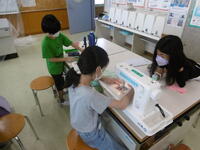 5年生では、家庭科の学習で「生活を豊かにするための布を用いた製作」として、エプロンづくりに取り組んでいます。製作をとおして、手縫いやミシン縫いなど、目的に応じた縫い方や用具の安全な取り扱いについて学びます。大多数の子どもたちは、ミシン縫いはもちろん、本格的な手縫いも初体験です。子どもたちは、自分の体の大きさに合わせて、エプロンの丈を縫う位置を決めて、手縫いやミシ縫いにチャレンジ!最初こそ、かなり手間取っていましたが、「お手伝いボランティア」の保護者の方々が、一人一人を丁寧にサポートしてくださったおかげで、ミシン縫いにも少しずつ慣れ、楽しく取り組むことができました。これから、さらに試行錯誤しながら作品づくりを進めます。子どもたちの力作が完成するのが楽しみです!ご多用の中、サポートをしていただいた保護者の皆様、ありがとうございました。