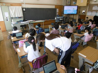 学校では、「GIGAスクール」推進の一環として、一人一台の学習用端末(タブレット)を効果的に活用した授業づくりを進めています。先日は、1・2年生がタブレットの中に入ってる計算ドリルソフトを使って、たし算・ひき算の問題にチャレンジしました。はじめこそ、操作方法にやや戸惑っていましたが、担任の先生やICT支援員の先生に教わりながらやり方をすぐに覚えていました。慣れてくると、どんどん問題を解いて自分で答え合わせをし、間違えた問題はもう一度やり直しながら、一人一人が自分のペースで、楽しく学習を進めました。
