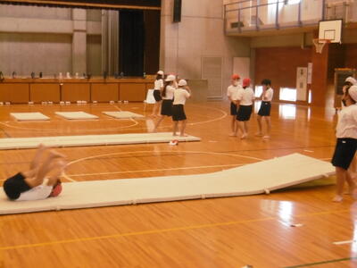 4年生では、体育の時間に「マット運動」に取り組んでいます。子どもたちは、いろいろな技にチャレンジしながら、マット運動の楽しさやできた時の達成感を味わっています。練習では、自分で「めあて」を立て、めあてに応じた練習の場を自分で選んで、友達と一緒に技のポイントなどをアドバイスし合いながら、一生懸命練習しています。練習を重ねるたびに、あちらこちらから「できた!」と歓声が上がっています。