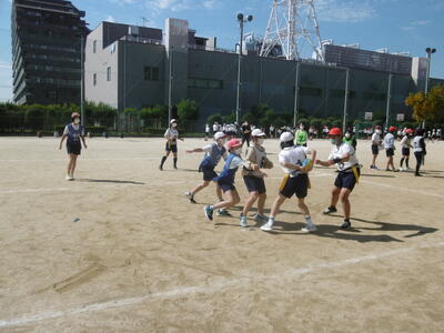 スポーツの秋!6年生では、体育学習で「フラッグフットボール」に取り組んでいます。「フラッグフットボールとは、「タグラグビー」に、アメリカンフットボールの要素を取り入れたニュースポーツであり、平成29年度改訂の小学校学習指導要領でも新たに紹介されています。このスポーツの大きな魅力(運動の特性)は、「戦略性」です。「ラグビーボールをいかにして敵陣地に運ぶか」について、相手チームの戦力や特色、ゲーム状況などを加味しながら、自分たちの作戦を組み立てて戦います。子どもたちは、ワンプレーごとに大興奮!パスやランなどを組み合わせながら、うまくいけばOK!うまくいかなかった場合は、新たにチーム内で相談し戦略を練り直します。もちろん、「OK!」「やったね!」「ドンマイ!」「大丈夫、大丈夫!」など、笑顔で互いのプレーを認め合い、励まし合っています!さすが、「あったかはあと」な最高学年です!