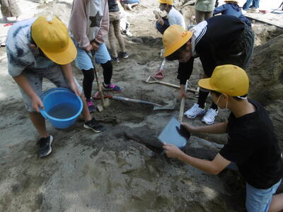 感染防止対策をしっかりとして、本物の縄文土器の説明を受けたり、石器を使って新聞紙を切ったりしました。