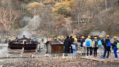湯元の源泉に到着しました。あたり一面に漂う硫黄の匂いに子供達も大興奮!おかげさまで、妙典っ子の気持ちは、既にひとっ風呂浴びた気分です。