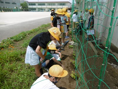 1年生のアサガオや2年生の野菜に負けず、少しずつ大きくなってきているのが4年生のツルレイシ(ゴーヤ)です。子どもたちは、観察カードを手に成長の様子を詳しく観察し記録しています。これから、梅雨が明けて本格的な夏を迎えると、2階から吊されたネットには、蔓と葉がうっそうと生い茂り、多くの実がなることでしょう。