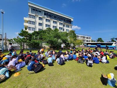 津波避難タワー・約15mの絶景のもとで、災害への備えを学びました。