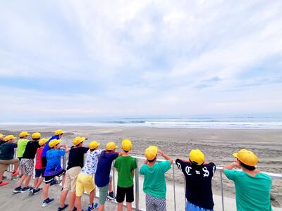 臨海学校の一日目のスタートです!天気にも恵まれ、笑顔の出発です。
