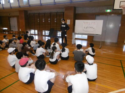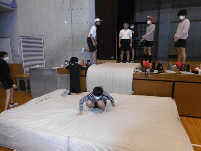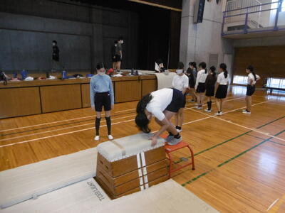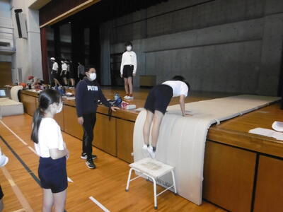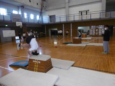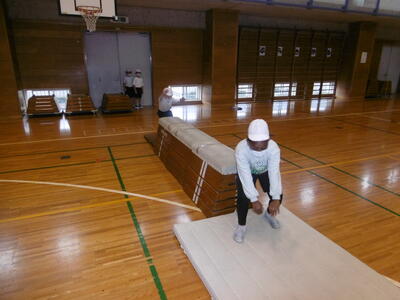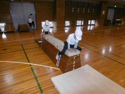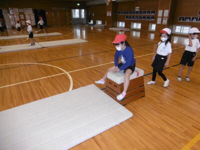 今、アリーナで行う体育では、跳び箱を使った運動遊び(1~2年生)や跳び箱運動(3~6年)に取り組んでいます。1~2年生では、跳び乗りや跳び下り、手を着いてのまたぎ乗りやまたぎ下りなどの運動遊びをしながら、体を支える感覚や腕を支点とした体重移動の仕方など基本的な体の動きを楽しく体感的に学んでいきます。3年生以上では、これらを基礎にして、切り返し系の技(開脚跳びやかかえ込み跳び等)や回転系の技(台上前転、前方倒立回転跳び等)に挑戦していきます。子どもたちは、それぞれの技のポイントを学びながら、自分のめあてに応じた練習の場を自分で選び、互いにアドバイスし合いながら、意欲的に練習に励んでいます。