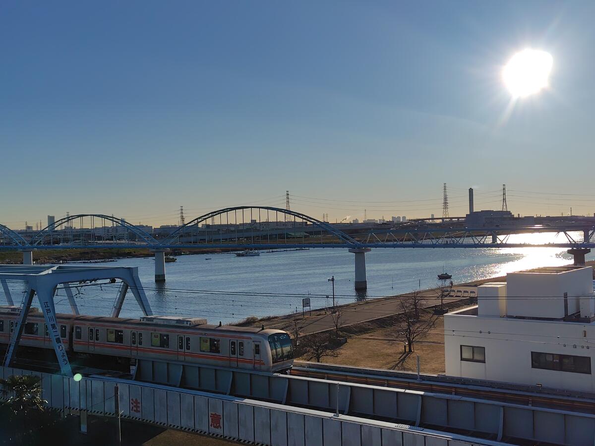 反対側の窓からは、江戸川と東西線、朝日が見えます。