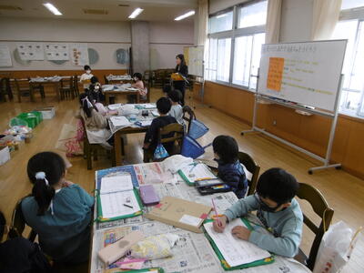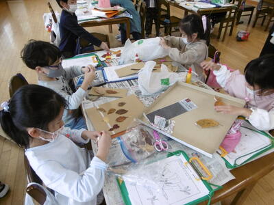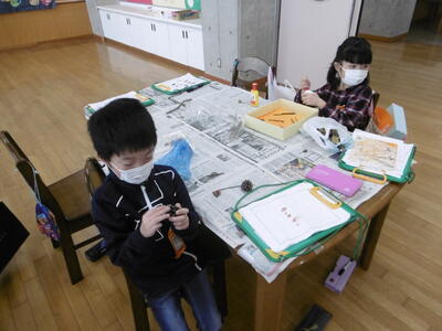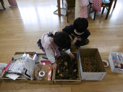 暦の上ではもう「冬」ですが、1年生は、今、生活科の学習で「秋」を満喫しています。子どもたちは、これまで、学校や公園の様子について「夏」と比べながら、季節の変化を感じ取り、様々な発見をしてきました。今度は、松ぼっくり、落ち葉、どんぐりなどの秋ならではの自然を生かした遊びを体験しています。「どんぐりゴマ」「松ぼっくりけん玉」「どんぐりやじろべえ」「どんぐり迷路」など、遊びのおもしろさや自然の不思議さに気付き、友だちと関わり合いながら、遊びを自ら工夫したり創り出しています。みんなで「秋祭り」を楽しみましょう!