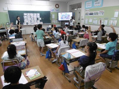 市川市の小学校では、外国語活動指導員やALTの先生が学習支援をしています。授業は、どちらも原則オール・インイングリッシュ!子どもたちは、友達と一緒に簡単なゲームや会話をしながら英語にたっぷり親しみ、楽しく活動しています。