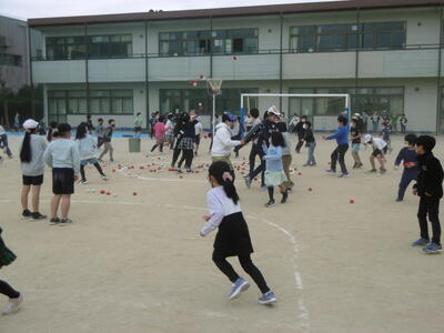 節分、校庭に突然「鬼」が大集合!3年生と4年生(1クラス)の子どもたちが、文字通り「鬼ごっこ」で大いに盛り上がりました。「悪い子はいねえかあ~!」なまはげもびっくりの迫力で、何人もの鬼が、子どもたちを追いかけてきます。鬼に捕まると、校庭の真ん中にある「鬼が島」に連れていかれます。子どもたちは、歓声をあげながら逃げるのに必死!鬼を撃退するアイテムは、玉入れに使う「お手玉」。鬼をめがけて投げつけます。「豆まき」ではなく「玉まき」です。約30分間にわたる大鬼ごっこに子どもたちは、「おもしろかったあ」と笑顔いっぱい!対して鬼たちは、疲労困憊…。でも、子どもたちが喜んでくれて、先生方も大満足の笑顔です。…月曜日の勤務、筋肉痛が心配です(笑)