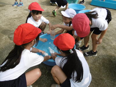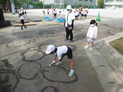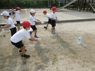 1年生が生活科の学習で水遊びにチャレンジ!マヨネーズ等の空の容器に穴をあけて、中に水を入れて手で押すと、水が勢いよく飛び出します。水鉄砲の要領で的当てをしたり、地面に水の絵を描いたり、シャワーのようにして水を掛け合ったり、子どもたちは、様々な遊びを体験しながら、様々な「気づき」をしていきます。例えば、勢いよく水を飛ばすなら、穴の大きさは、どれくらいがいいのか。遠くの的へ水を当てるには、容器をどんなふうに押すといいのか。水を吸った地面は、どんな風になっているか…など。友だちと一緒に楽しく遊びながら、学んでいます。