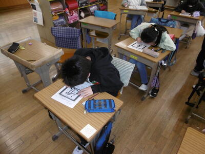 5年生の書き初めの課題は、「世界の国」。画数も多く難しい課題ですが、子供達はお手本をよく見て、力強く書いていました。