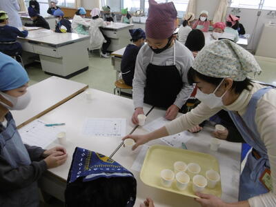5年生が、家庭科調理実習「味噌汁づくり」に先立ち、「出汁(だし)」について学習しました。味には、「甘味」、「苦味」、「酸味」、「塩味」、「うま味」がありますが、「出汁」の味は、「うま味」にあたります。子どもたちは、栄養士の宇佐美先生のご指導の下、「かつおぶし」、「こんぶ」、「煮干し」の3種類の「利き出汁」にチャレンジ!味、におい、色などを比較・吟味しながら、しっかりとその特徴を捉えて選定していました。また、「出汁入り味噌汁」と「出汁無し味噌汁」の味比べをしました。「全然違う!」「出汁が入っている方が、ずっと美味しい!」「泣きたいくらい美味しい!」など、口々に感想があがっていました。日本料理の真髄を体感・実感し、出汁文化の奥深さに感激した子どもたちです。