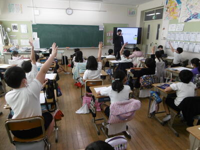 3年生では、総合的な学習の時間で「江戸川」をテーマに探究学習に取り組んでいます。学校前の江戸川放水路は、生物多様性の宝庫。子どもたちは、これまで江戸川放水路の干潟に繰り返し出かけ、市川自然博物館学芸員の金子さんや地域学校協働活動推進員の安達さんのご指導のもと、様々な生き物と出会い、触れ合ってきました。子どもたちの探究心は、とどまることなく、知りたいことや疑問が次々と湧いてきます。先日は、2組が、安達さんをゲスト・ティーチャーにお迎えして、「カニについての24の質問」について、教えていただきました。「カニによって、巣の形が違うのはなぜですか?」、「カニは、巣の中で何をしているのですか?」など、鋭い質問のオンパレードに、安達さんも嬉しそうに目を細めなら、写真や図を使って分かりやすく解説してくださいました。「実は、自然の世界のことは、まだよくわかっていないことがいっぱいあるんですよ。だから、よく観察することが大事なんだね。」授業終了後も、子どもたちからは、「おもしろかったあ!」「また、やりたい!」の声がたくさんあがっていました。