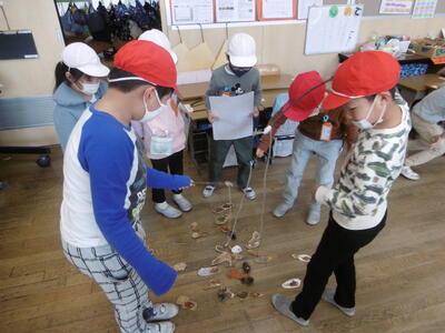 1年生が生活科で取り組んできた「あきとあそぼう」もいよいよクライマックス!子どもたちは、これまで自分たちで工夫しながら手作りした「秋のおもちゃ」で、「秋まつり」を楽しみました。お客さんとお店の人を交代しながら、お互いが作ったおもちゃで夢中になって遊んでいます。お店の人になったときは、「いらっしゃい!」「やってみてください!」「楽しいですよ!」など、呼び込みの声も元気いっぱい!秋まつりを大いに満喫しました。