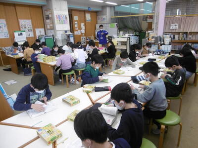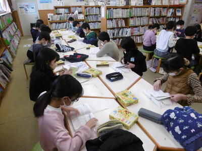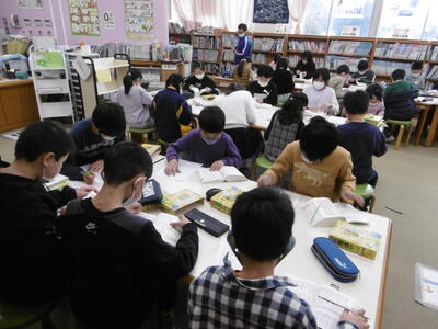 学校図書館行事として、ブックス委員会主催の「辞書引き大会」を実施しています。国語辞典を使って、ワークシートに記載されている「言葉(単語)」(20~30個)を5分間でどれだけ多く引くことができたかを競います。「辞書の引き方に慣れ、対象の言葉をいかに素早く正確に見つけるか」が、勝利のカギ。「始め」の合図で、子どもたちは一斉に辞書を手に取り、夢中でページをめくっています。しかし、焦れば焦るほど、見つからないなんてことも…。ゲーム感覚で楽しみながら、国語辞典を活用して自ら調べる・学ぶ習慣を身に付けるとともに、多くの言葉に慣れ親しみ、ボキャブラリーを豊かにしてほしいと願っています。
