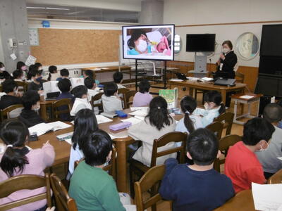 2年生が、生活科「自分発見」の学習として、助産師さんをゲストティーチャーにお迎えし、命の誕生についてお話を伺いました。おなかの中で赤ちゃんを育てているときのお母さんの気持ち、お産の様子、生まれてきた赤ちゃんへの家族の願いや思いなどについて、貴重なお話を伺いことができました。また、おなかの中で育っていく赤ちゃんのエコー写真や生まれたばかりの赤ちゃんの写真なども見せていただきました。子どもたちは、お話を聞きながら、自分が生まれたときの様子や家族の気持ちに、思いを巡らせていました。
