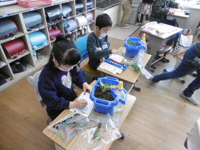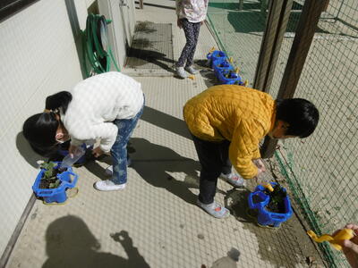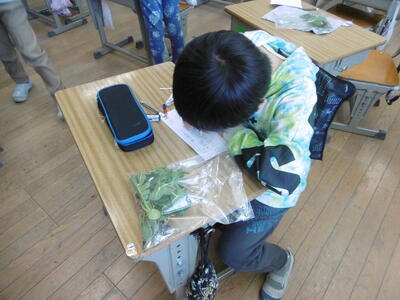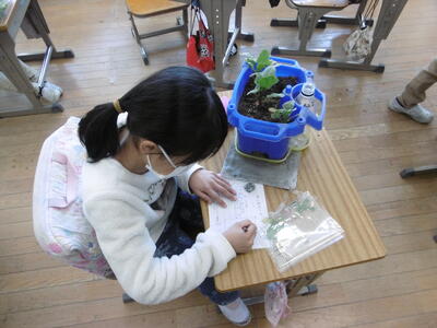 大根、ラディッシュ、水菜、ホウレンソウ…。2年生が一人一鉢栽培で育てている「冬の野菜」が、収穫の最盛期を迎えています。「大きくなってる!」子どもたちは、青々と茂った若葉をうれしそうにながめながら、成長の記録と収穫を楽しんでいます。採れた野菜は、ビニール袋に入れて家まで大切に持ち帰ります。収穫後も、葉っぱがまた伸びてくることを願いながら、水やりにもいっそう気合が入っていました。子どもたちが一生懸命育てた瑞々しい冬野菜、ぜひ、ご賞味ください。