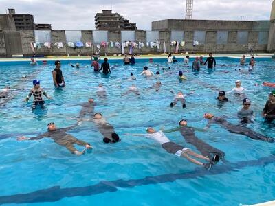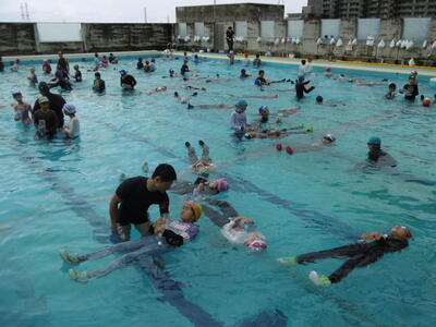 5年生・6年生が着衣水泳を体験しました。指導してくださるのは、市川市西消防署の小林さん(水難学会着衣泳指導員)をはじめ3人の職員の皆さんです。子どもたちは、実際に着衣のままで「背浮き」を体験!最初こそ、おっかなびっくりでしたが、「手足をバタバタ動かすとかえって沈みやすいこと」、「靴は、脱がない方が浮力が増すこと」等を実感!事故に遭遇した際には、「鼻と口を水面に出して、浮いて待つ」ことの大切さと具体的方法を体験を通して学ぶことができました。また、事故発生から救助されるまでの「チェーン・オブ・サバイバル(救命の連鎖)」についても、実技を交えながら、詳しく教えていただきました。妙典小は、学区に江戸川放水路や河川敷を有しています。また、夏休み中、海や川など水辺のレジャーを楽しまれるご家庭も多いと思います。ぜひ、ご家庭でも、水難事故防止について、お子様と話し合ってください