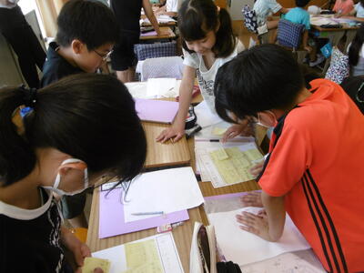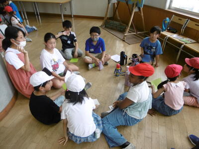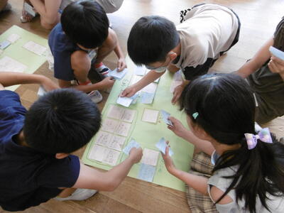 なぞなぞ、クイズ、フルーツバスケット、マジカルバナナ、爆弾ゲーム、色紙、オセロ、落語…。どのグループも笑顔いっぱい!4年生が2年生を上手にサポートしながら、仲良く楽しく遊んでいます。もちろん、小さなトラブルは必ずと言ってよいほど発生します。トラブルが起きたらどうすればよいのか、どうすれば、みんなが楽しく遊べるのか…。近年、生活様式の変化や少子化により、地域において異年齢の集団で遊んだり活動したりする機会が目に見えて減少しています。このことが、子どもたちのいわゆる「社会性」の未熟さの一因になっているという指摘もあります。上級生への憧れや尊敬、下級生から頼られる自己有用感、小さき者や弱い者への慈しみや優しさ、違いを認め合う意識や上手に折り合いをつける力等、異年齢集団での遊びや活動を通して学んでいく力は、少なくありません。学校の教育活動に意図的かつ継続的に取入れていくことで、子どもたちに、社会性を育んでいきたいと思います。