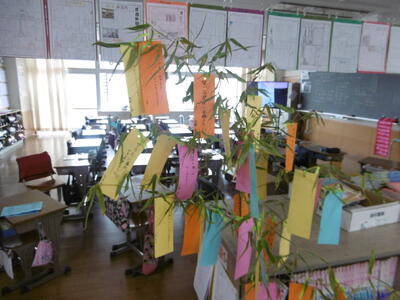 ♪笹の葉さらさら 軒端にゆれる…。今日、7月7日は七夕。子どもたちは、どんな願いを短冊に託したでしょう。「ぱんやさんになれますように(1年生)」、「サッカーのリフティングが45回できますように(2年生)」、「世界に平和がおとずれますように(3年生)「好きな子とけっこんできますように(4年生)」「妙典ドリームスが強豪校になれますように(5年生)」「よい本と出会えますように(6年生)」…。妙典っ子の願い事が、かないますように。