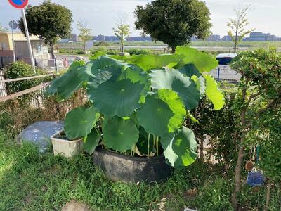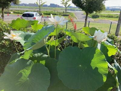白い可憐な「はすの花」が、早朝、暑さに負けず、きれいに咲いています。背丈も葉っぱもぐんぐん大きくなってきました!