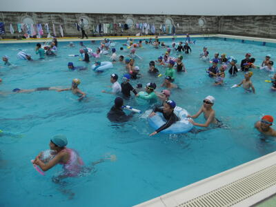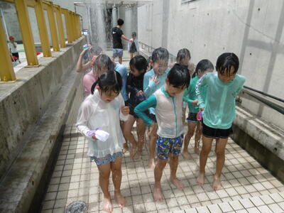おかげさまで、今夏の水泳授業を大きな事故なく無事終了しました。今年度は天候にも恵まれ、各学年とも予定通り5回(10時間)実施することができ、5・6年生では、別途「着衣水泳」にもチャレンジしました。子どもたちは、水中じゃんけんや宝探し、波のプールや流れるプールなどで水遊びをしたり、コース別に分かれて「け伸び」や「バタ足」、クロールや平泳ぎなどの泳法を練習したりしながら、自分のめあてに向かって、安全に楽しく活動しました。記録会で泳力が伸びたことを実感している子どもたちも大勢いました。夏休み中、ご家庭でも、機会がありましたら、お子さんの成果をぜひ見てあげてください。