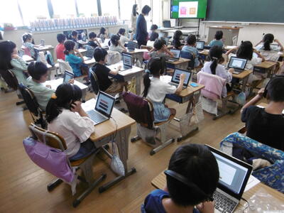 2年生が一人一台の学習用端末(タブレット)を使って、新しいドリルソフトを体験学習しました。子どもたちは、さっそく読み書きチェックテスト(ひらがな、漢字、読み取り)に挑戦!提示された映像を見たり、ヘッドホンから流れてくる音声を聞いたりしながら、問題に答えていきます。もちろん、即時自動採点機能が付いていますので、すぐに答え合わせができます。正解すると花丸が画面にアップになり、次の問題へと進み、間違えると、再度チャレンジができます。子どもたちは、ゲーム感覚で問題を一つずつ攻略しながら、自分のペースで楽しく学習を進めていました。