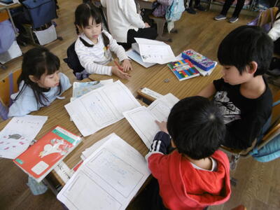 「スイミー」と言えば、みんなが知っているレオ・レオニ作の絵本です。1年生の国語の教科書にも、教材として掲載されています。子どもたちにも大人気!学校や家で繰り返し音読しては、お話の世界を楽しんでいます。「ところで、スイミーって、ひとつの文にして表すと、どんなお話かな?」子どもたちは、「〇〇〇なスイミーが、〇〇〇して、〇〇〇するお話。」という文で、お話の内容を上手にまとめながら、友だちと一緒に楽しく学習を深めています。