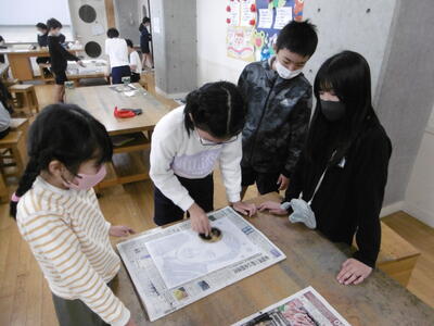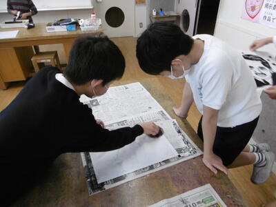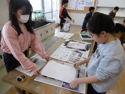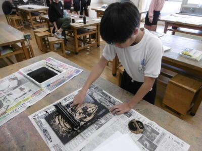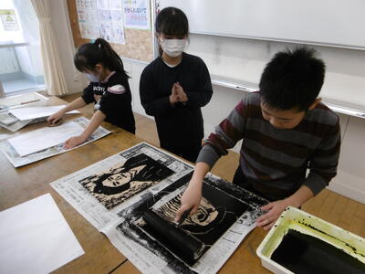 5年生が一生懸命取り組んできた木版画の制作。子どもたちは、陰影の効果を工夫しながら、「浮彫」という手法で、「歴史上の人物の肖像画」を彫刻刀で丁寧に彫り進めてきました。いよいよ「刷り」のクライマックス!版木の上に、インクをローラーで伸ばして、和紙を載せてバレンでこすります。「どんなふうにできているかな…。」ワクワクしながら和紙をめくると、見事な作品が完成!子どもたちは、大満足の笑顔です!