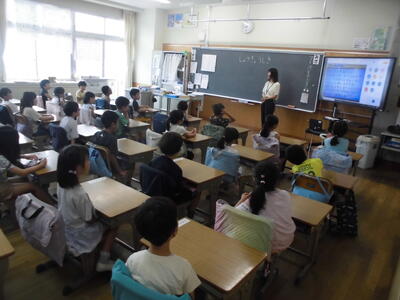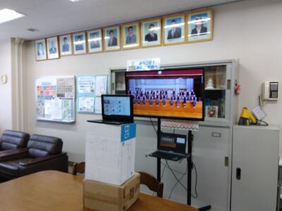 暑さ対策として、校長室を急遽スタジオに見立てて、オンラインで終業式を行いました。