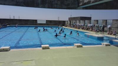 ワクワクドキドキしながら、プールサイドに並んで注意事項をきいて、しっかり準備体操をして初めてのプールを楽しみました。