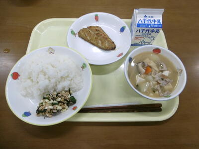・牛乳 ・わかめごはん ・ぎせい豆腐 ・きんぴら ・小松菜と油揚げの味噌汁