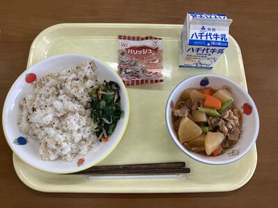 ・牛乳 ・じゃこごはん ・豚肉と大根のふくめ煮 ・磯香和え ・小魚のパリッシュ