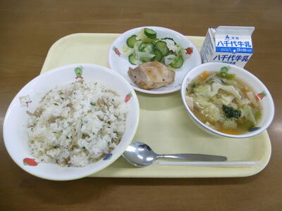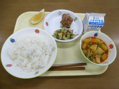 ・牛乳 ・ごはん ・鶏のから揚げ ・野菜の塩昆布和え ・インド煮 ・美生柑(果物)