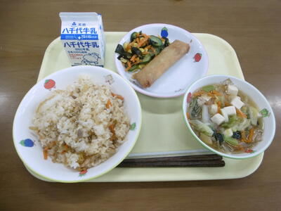 ・キムタクごはん ・春巻き ・わかめのサラダ ・マカロニスープ